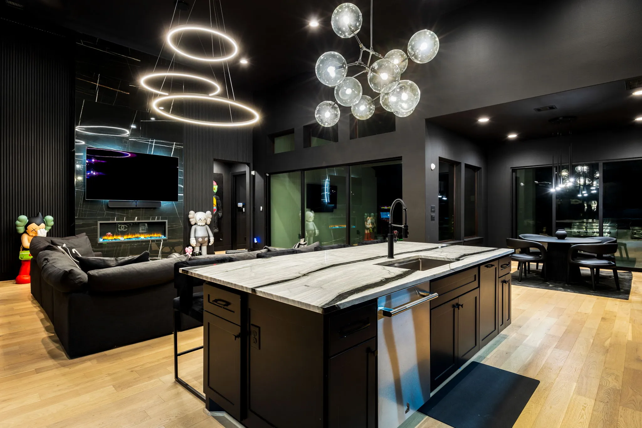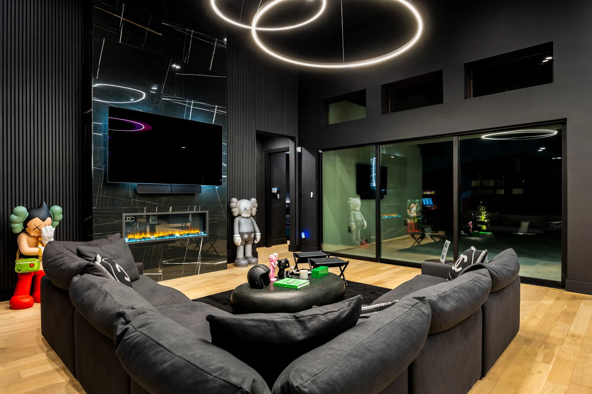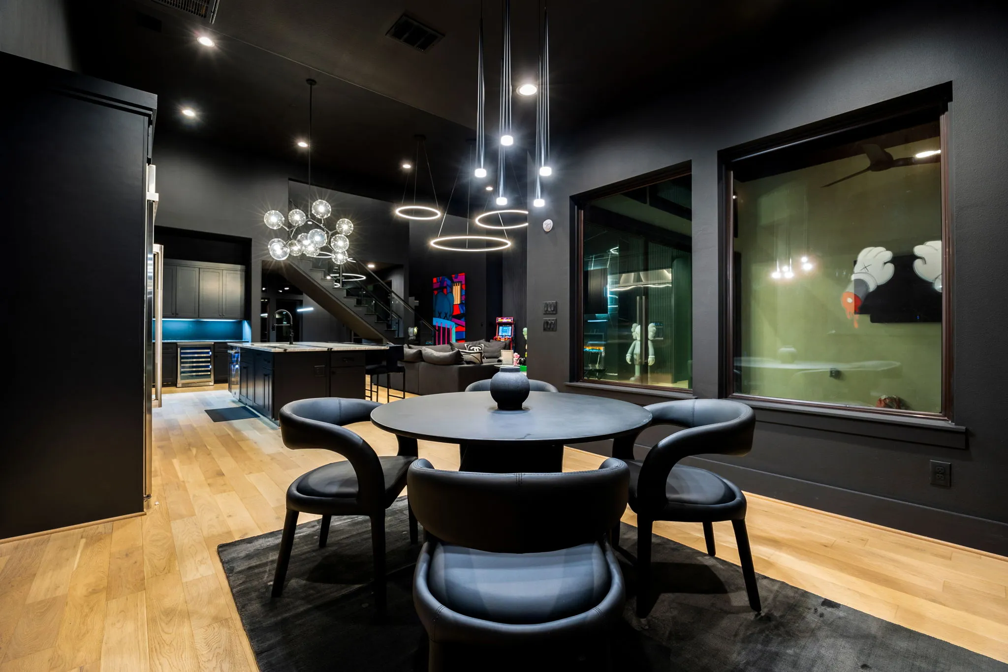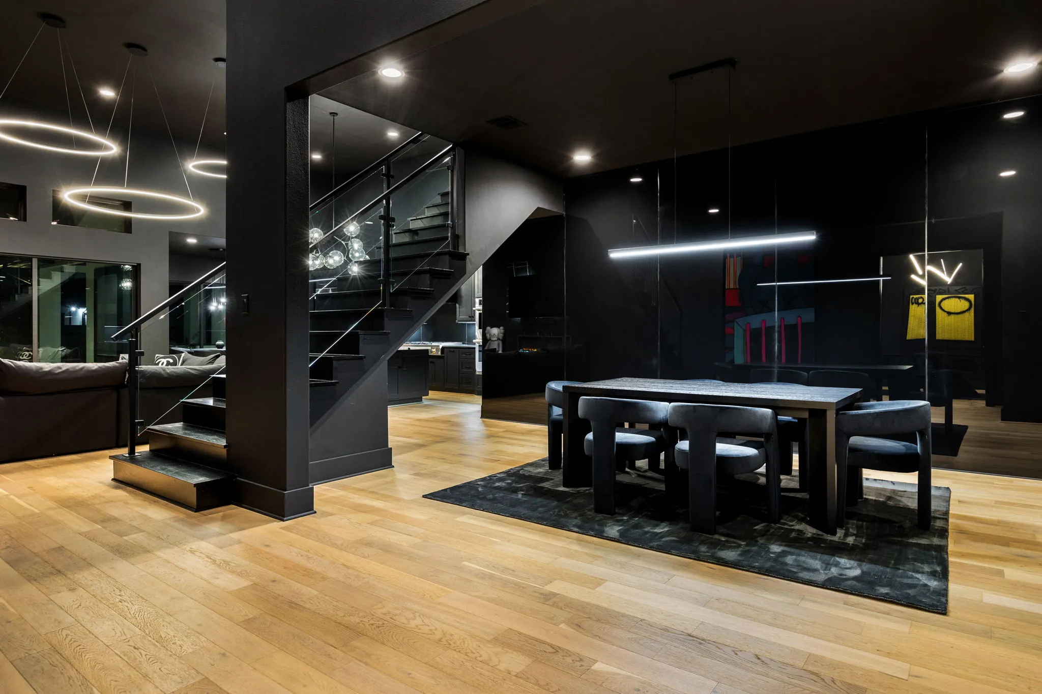 This innovative interior design project was crafted for a dynamic 21-year-old NFL client who envisioned a bold bachelor pad, centered around his favorite color: black. Embracing this unique vision, I transformed the space into an extraordinary home that stands out as a true masterpiece. Central to the design is a stunning glass staircase that adds a touch of elegance and openness, complemented by modern chandeliers that illuminate each area with a sophisticated glow. The walls are adorned with exquisite European artwork, enhancing the artistic ambiance of the space, while an Italian-made fireplace serves as a luxurious focal point. In the movie theater, a Rolls-Royce star ceiling creates a celestial experience, complete with custom LED panels that can adjust the mood for any occasion. This design beautifully blends elements of a playground with the sophistication of an art museum, resulting in an atmosphere that is both playful and visually striking. I am grateful for the opportunity to bring this concept to life, creating a space that reflects my client's youthful spirit and sets a new standard in modern living.