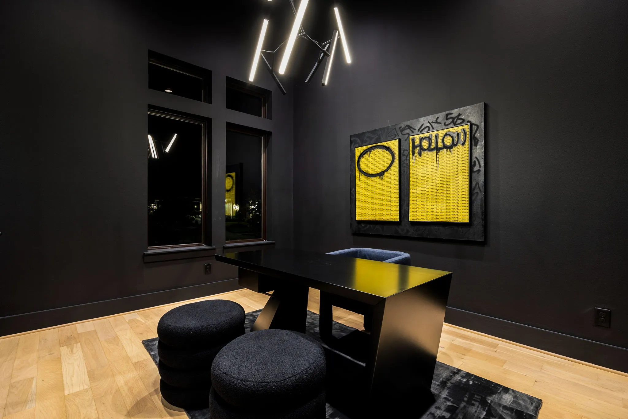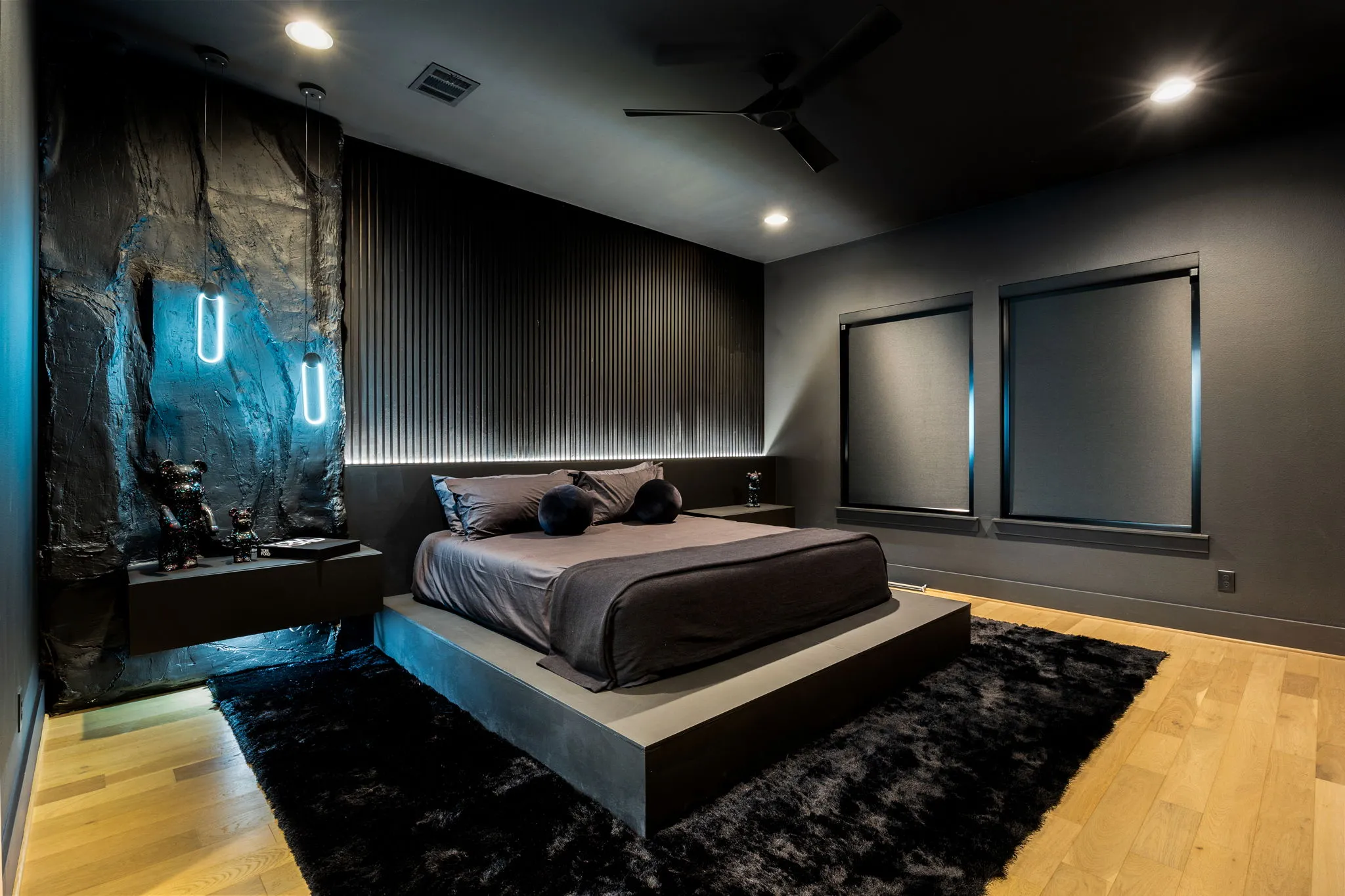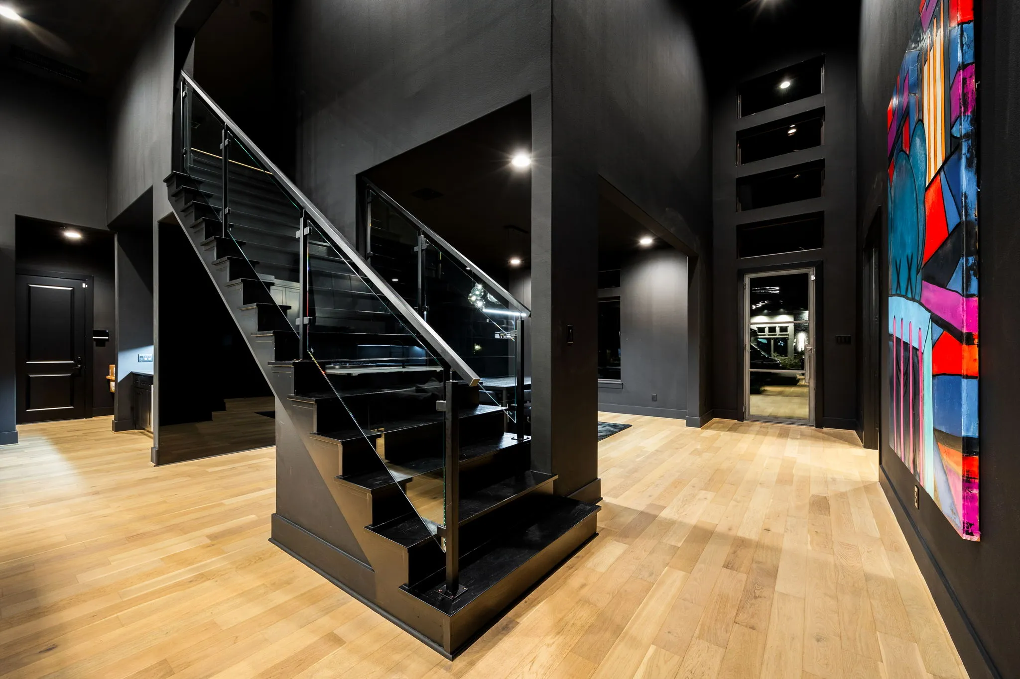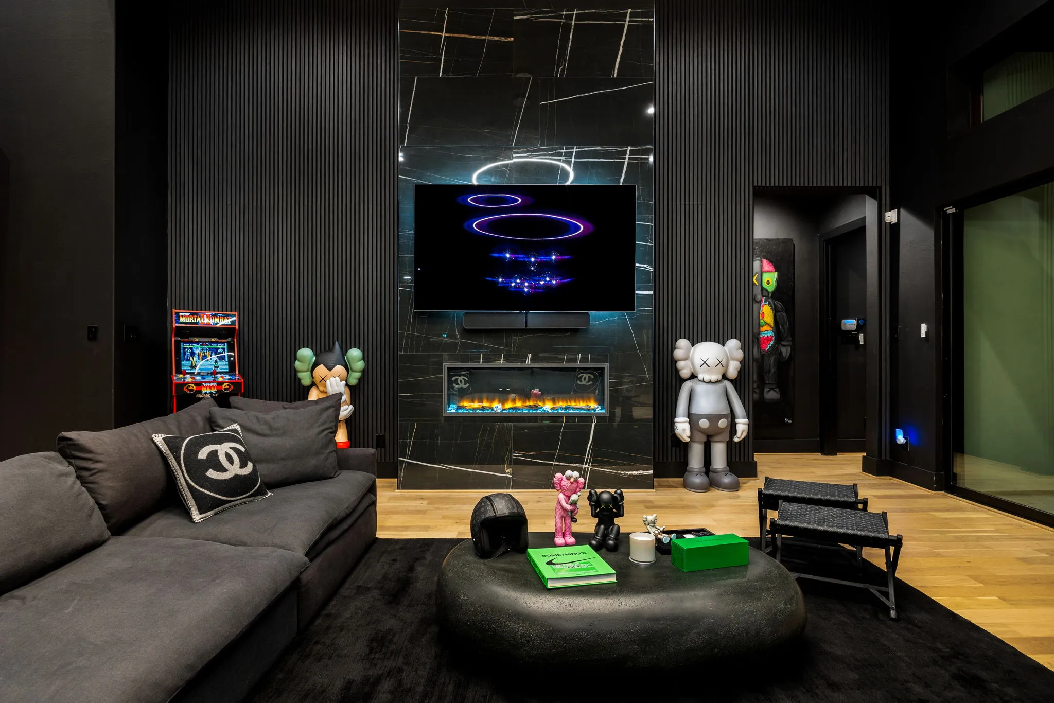 This innovative interior design project was crafted for a dynamic 21-year-old NFL client who envisioned a bold bachelor pad, centered around his favorite color: black. Embracing this unique vision, I transformed the space into an extraordinary home that stands out as a true masterpiece. Central to the design is a stunning glass staircase that adds a touch of elegance and openness, complemented by modern chandeliers that illuminate each area with a sophisticated glow. The walls are adorned with exquisite European artwork, enhancing the artistic ambiance of the space, while an Italian-made fireplace serves as a luxurious focal point. In the movie theater, a Rolls-Royce star ceiling creates a celestial experience, complete with custom LED panels that can adjust the mood for any occasion. This design beautifully blends elements of a playground with the sophistication of an art museum, resulting in an atmosphere that is both playful and visually striking. I am grateful for the opportunity to bring this concept to life, creating a space that reflects my client's youthful spirit and sets a new standard in modern living.
